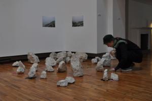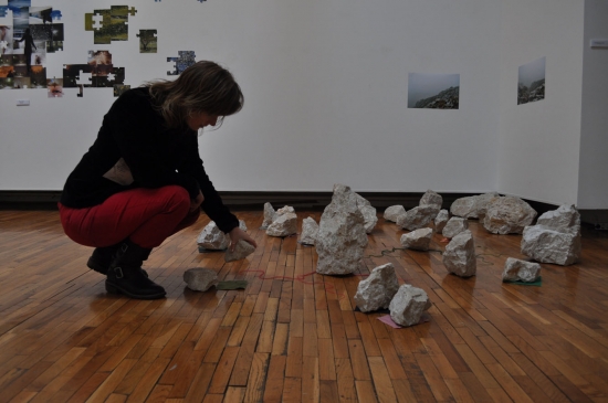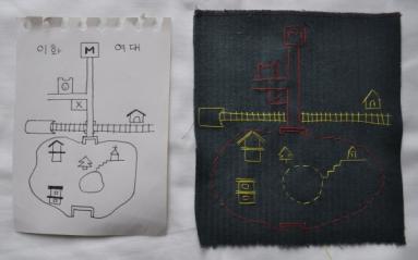 J’ai demandé aux artistes français et monténégrins participant à l’exposition de me dessiner un plan qui me mènerait à leur maison, ou un endroit dans lequel ils se sentent bien. Ces plans vite esquissés, réduits parfois à de simples repères topographiques, je les ai réinterprétés à la couture, sur des morceaux de tissus de même taille, que j’ai caché sous des pierres. Ainsi, tel Le Petit Poucet qui retrouve sa maison par les cailloux qu’il a semé, le spectateur retrouvera son chemin en soulevant les pierres.